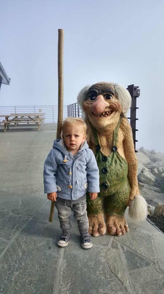 We stayed for an hour hoping that it might lift, but had no such luck. So, we headed back down. Jack did manage to find another troll to take a photo with though.