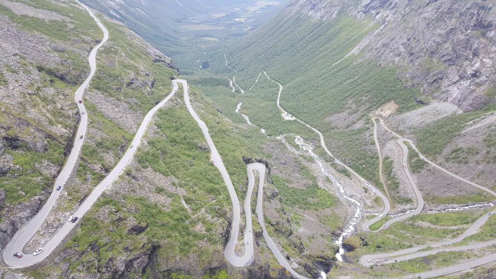 More amazing scenery lay ahead of us as we made our way to Trollstigen, an impressive road that stretches along the landscape. There was a viewpoint at the top, which gave us a pretty cool glimpse of the road below that we were about to take. It looks like a pretty crazy road, but compared to the first one we did, it was relatively easy for Richard to drive down.