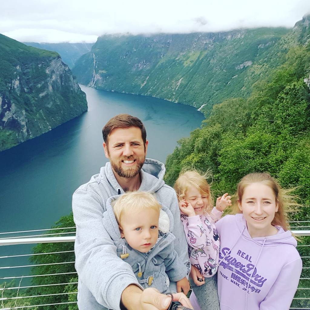 Further along we wound our way up Eagles road through 11 hairpin bends to see another viewpoint over Geiranger. The view down was still absolutely stunning, so we didn’t miss out completely. And of course, we took the chance to capture a family selfie.