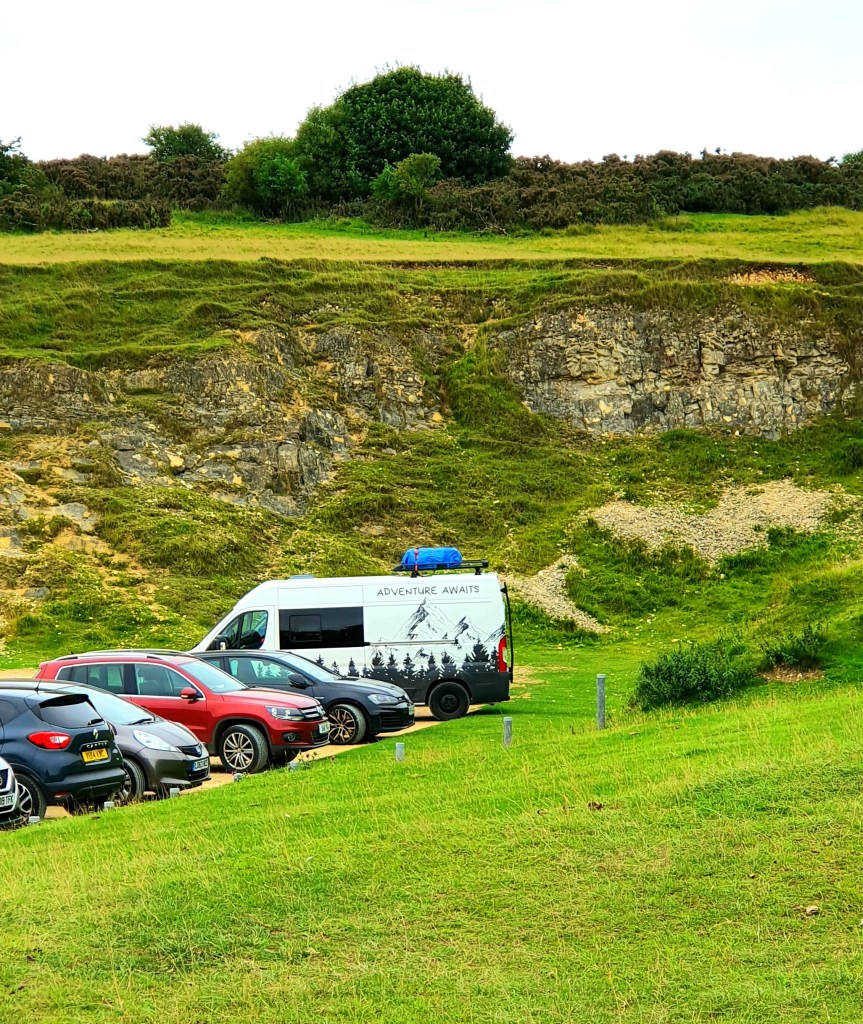 Free car parking just beyond the golf club (car park for Cleeve Hill – GL52 3PP. Tight entrance but doable in our van.